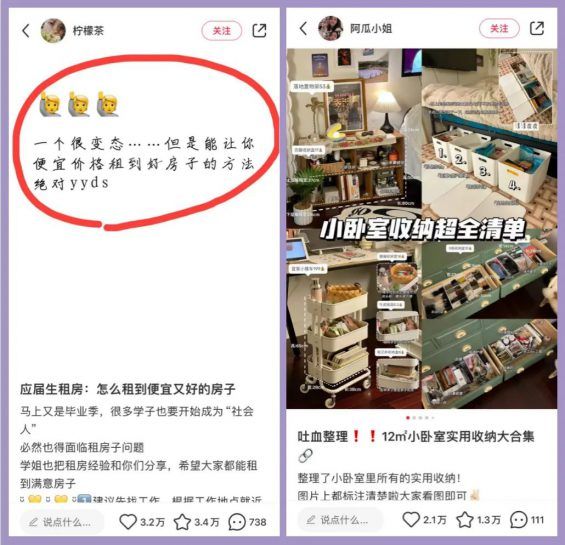 2、需求切入 除了人群之外,还可以从目标人群的痛点和需求点入手。 比如围绕“租房”,就可以从用户比较关注的价格、地段、大小等方向切入。 像下面这类“应届生租房”、“便宜价格租到好房”、“小卧室收纳清单”等笔记,之所以爆款频出,就是因为满足了用户实际的痛点和需求。