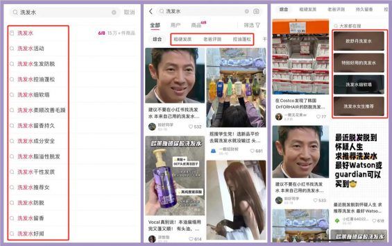 02 6个技巧确定优质标题 作为第二大搜索种草平台,小红书的搜索流量占比非常高。 我们也可以通过搜索关键词,找到用户关注的内容布局在标题里。 比如搜索“洗发水”时,“生发防脱”、“控油蓬松”、“细软塌”这些词都在前排。 说明这些都是用户比较关注的产品功效关键词,把它们放在标题里,用户就能搜索到,提升笔记的曝光。