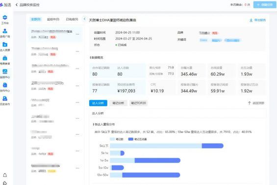 哪些达人还没交稿,哪些达人还没有审稿,哪些合作笔记还没有进行投放,从选品、选号、商务跟进、内容发布跟进、投后数据监控、项目实时看板到项目复盘报告生成,这个平台都有着非常完整的一套流程。其次,加选上的【选号广场】功能,也可以帮助很多对于投放达人广告还不太了解的中小商家进行一站式账号的筛选和询价。。