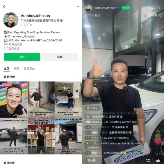 尤其是像造车新势力的车型,许多国家都没有销售网点,就连刚上新不久的小米汽车,都有在卖。 除了汽车外,还有一些工程器械类的账号,以及少数百货类的。 但账号的整体互动数据是很不错的,其中有一个河南50多岁大姐的散装英语卖车,希望了大量海内外的用户。 二、为什么视频号也能做跨境生意? 很多人提到跨境电商的时候,根本就不会想到微信,但实际上,微信视频号的用户已经很多了。 1. 微信客户 相关的数据显示,微信在海外的用户就超过了一个亿。 而在中国的老外,几乎都要用到微信,不仅是沟通、还有支付。 2. 中国人 除了老外,中国人,华侨、华裔等,分布在全世界各地,他们也会用到微信来做交流和做生意。 三、中国有着强大的供应链优势 为什么中国产品能够通过微信直接卖到全世界,还不用去区分所谓的跨境版、海外版。 除了有大量的用户在使用微信,另一个很重要的地方,就是中国有着无法比拟的供应链优势。 其一,以汽车为例,这几年中国汽车的品质、功能获得了很多人的认可。 根据乘联会整理的海关数据,2021年到2023年,中国汽车出口实现“三连跳”。2023年中国汽车出口突破522万台,出口额突破1016亿美元,出口的数量和金额均达到世界第一。