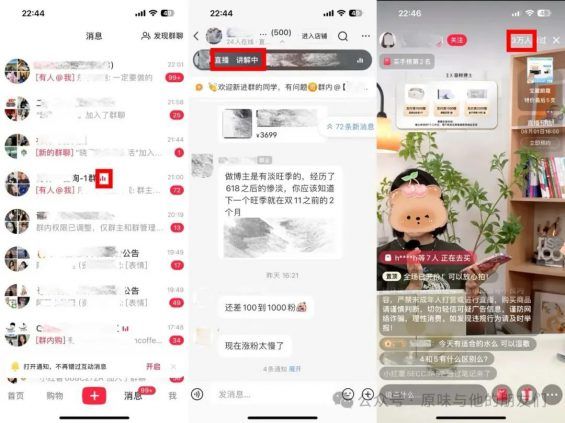 你有没有发现,品牌群聊下面还有很多“认为我感兴趣的群聊”进行推荐,这逐一告诉我们小红书也想做自己的私域,而不想自己的流量去其他的平台。 3. 产品套组+直播间精致布局,提升转化率 这个品牌其实客单价都很低,所以再用福利特价的方式拉新客户,通过预热+群聊的形式进直播间去做转化。 直播间的搭建也是非常有少女感,同时主播一问一答的方法,直戳痛点和需求点,配合小助理答疑解惑,吸引用户下单。 直播时再互动抽奖,因为小红书直播界面跟视频号直播还是有点区别,导致很多用户会评论哪里抽奖,把直播间的人气拉起来。 在直播之后,AMORTALS尔木葡还会在群聊中引导用户晒图,或晒单内容布局,目的就是为了去追单或者复购。
