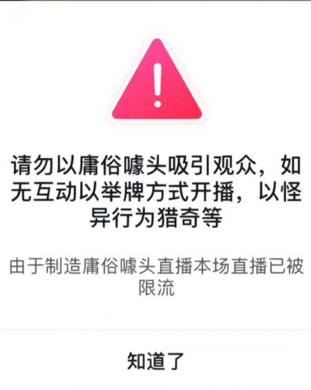 这种情况下的正确选择还是:继续播! 因为此时抖音没有强制主播下播,中途下播,意味着你放弃了直播后半段的流量。 数据突然下滑,会导致抖音默认主播丧失了直播能力,影响下一场或下几场直播的流量数据。 3“经审核,您已经触犯了XX违规,即将对您进行为期XX(时间段)的限流处罚”