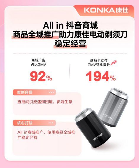 同时【商品全域推广】满足多场景的投放需求,覆盖短视频、商品卡、图文等体裁,让商家在内容场和货架场同时拿量,一站式触达全域流量。 康佳剃须刀在抖音直播间引流的基础上,加码【商品全域推广】试水货架场,使得商品卡支付 GMV 环比翻了两倍多,真正实现了全域流量打通。