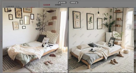 再比如做家居IP的同学,但是自己家布置的并没有很好看。 那你可以网上找一张你喜欢的家居效果图,投喂给AI, 让他在原图的基础上,做布局的修改。 效果如下图: