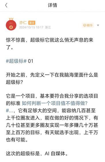 1、起步阶段(2024年7月) 去年一直感觉AI是风口,但不知道自己怎么切入进去,然后我想到:可以试试做视频。虽然我可能不会成功,但是我可以掌握更多AI技能——费曼学习法,倒逼自己输出。 我在使用过程中,积累了不少经验,也踩了很多坑。想着与其藏着掖着,不如把这些经验分享出来,帮助更多人少走弯路。 我最开始做AI账号,是在2024年7月28号,发布了我的第一个作品。当时没进生财,都是自己瞎琢磨,也就是模仿。 但是不知道什么定位,选题,封面,当时就是感觉可以做,一腔热血,反正发出来再说。 然后做了一周,没啥起色,开学后,时间管理困难,收益也并不明显。 2、转折期(2024年10月) 10月15日,老大首个超级标发出来,让我再一次坚信,这个机会前景巨大。