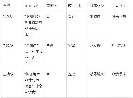 ❖ 1)开场画面: 确保第一帧画面具有视觉冲击力,可以使用鲜艳色彩、动态效果或悬疑设计。 ❖ 2)开场话术: 使用疑问句、悬念或情感共鸣的开场白,在前3秒就传达核心价值 ❖ 3)节奏把控: 开场节奏要快而有力,避免过于缓慢的铺垫 2、完播率 反映观众观看视频的完整程度,是衡量内容质量的重要指标。优化建议: