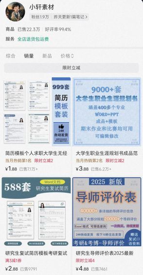 PPT简历模板绝对是校园、职场的刚需领域,打工人求职、汇报,学生党比赛、答辩都离不开这些。 而想要在小红书上面卖出PPT 简历模板,得先做好以下两个方面: (1)店铺方面 在店铺品类上要覆盖全场景,并且尽量垂直细分,主打一个应有尽有。 比如针对大学生,推出色彩活泼、突出个人优势的比赛PPT模板;为研究生设计学术风浓厚、逻辑清晰的答辩PPT模板;给职场人提供商务简约、数据可视化强的工作汇报模板…… 以四月成交额高达10w的@小轩素材为例,作为专注于“大学生”“研究生”等学生群体日常需求的店铺,他的在售商品聚焦了开题答辩、工作简历、复试简历多个场景。 而且除了这些常规模板之外,还附加了“大学生职业规划书”“大学生创业创新规划书”“导师评价表”等范文模板,全面满足学生群体的需求。