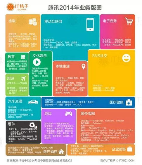IT桔子数据库中,2014年腾讯所投资或收购的公司超过46起,根据公开金额的投资粗略估算达到70亿美元。 从腾讯2014投资所覆盖的行业集中度来看,游戏、消费生活O2O、电子商务、移动互联网、文化娱乐等是TOP5细分行业;从投资金额的分布来看,腾讯 花费最多资金量的TOP5行业是消费生活O2O、移动互联网、游戏、电子商务、文化娱乐,两个分布行业基本一致,除开金额大小差异之外。 消费生活对于腾讯而言,是2014年的战略重点,一方面这个领域已成为BAT角逐最激烈的方向,另一方面则是对于腾讯或微信而言,消费生活服务是必然要 拓展的重要领域,腾讯2014年在这个领域的投资很多、花钱也大方。最大手笔的投入当属58同城市,围绕其上市前后、进行了3轮投资,总金额达到8.6亿 美元的同时,腾讯持股比例也达到了24%,非常重要的股东地位,除开财务回报外,两者在业务上的结合也值得关注。另外一个大手笔当属大众点评网,虽然未透 露具体金额,但腾讯持股比例达到20%、相比大众点评接近10亿美元的估值,也是一笔非常大的投资。此外投资还包括华南城、e家洁、e袋洗等。 接下来是在游戏方向,这是腾讯的主营业务收入,也是腾讯2014年投资数量最多的领域,和往年不一样的是,在腾讯所投资的9家游戏公司中,仅仅2家是国内的,其他7家都来自国外,而且国外投资同样大手笔,累计金额超过6.6亿美元。 电子商务应该算腾讯心中的一根刺,自己做业务、一直没有特别成功,于是在2014年改变做法、在投资上面大刀阔斧,投资了4家公司、金额达到6.5亿美 元,大手笔或者战略级的投资当属2.14亿美元投资京东商城、并把拍拍网等一些电商业务诸如到京东之中,接连着围绕电商、微信商城进行了非常多的合作;移 动电商也是腾讯在重点关注的,这个领域投资了口袋购物、继续追投了买卖宝,此外围绕电商的配送快递环节,投资了共享经济模式的人人快递。 移动互联网领域,虽然腾讯持有微信这张船票,但在投资上毫不放松,2014年继续投资,而且金额不小,但这些投资基本没在应用层面,还是在一些底层或者 基础服务板块,包括做导航的四维图新、科菱航睿,还有商用WiFi解决方案、连接商家移动端服务的WiWide迈外迪,另外一个是在渠道和刷机领域的刷级 大师。 文化娱乐同样是腾讯重点关注的方向,毕竟整体而言腾讯是个互动娱乐公司,在这个领域有着天然的优势。腾讯2014年在这个领域的投资包括与阿里巴巴、平安集团一起斥资36亿元入股华谊兄弟、数亿元战略入股华彩控股,还有300万美元投资视频服务提供商红点直播等。 SNS社交虽然是腾讯所擅长的领域,但面对新生代社交,腾讯仍旧不敢在这个领域掉以轻心,2014年的3起投资都是新玩法的,包括国内的Blink快看;国外则有匿名社交网络Whisper、熟人社交网络Heirloom。 智能硬件方向,腾讯仍在小心探索、而且除开PICOOC外,其他所投资的公司基本都来自国外,包括Tile、AltspaceVR、 Scaled Inference等,金额也不太多整体才三四千万美元。 在互联网与传统行业结合、消费升级的领域,与阿里巴巴一样,腾讯在汽车交通、医疗健康、教育、旅游、金融、房产酒店等领域也进行了比较多的投资和布局, 几乎是争相相对的。这些行业的业务是腾讯自身以前触及比较少的,但却是当前很多创业公司所重点摸索的,在这样的时间点上,通过投资来做这些垂直行业可能更 高效一些。交通出行上,腾讯继续大手笔投资滴滴打车;医疗健康上,腾讯首次开始布局,覆盖软硬件、移动及PC,包括1亿美元投资挂号网、7000万美元投 资丁香园、2100万美元联合京东投资PICOOC;教育领域则先后投资了跨考教育、优答等;金融上投资了人人贷、富途证券;旅游领域投资了同程网、面包 旅行、我趣旅行;房产酒店则是1.8亿美元投资乐居。 对于国外投资,腾讯在2014年动作比较大,13起国外投资,涉及金额近13亿美元;其中8起是游戏相关的投资。 2、腾讯的互联网版图 三、百度 2013年百度是大手笔投资、在BAT当中花费金额最多,到了2014年,百度不再那么疯狂,相对保守一些,整体的投资节奏放慢了,在自有业务方面,百 度也同样如此,更多是在做一个技术积累的过程,在新产品和新服务的布局也不是太多,但对于自己特别看好的领域如教育、硬件,百度也绝不手软,动作非常快 速。相比阿里巴巴、腾讯还不一样的是,百度加大了前沿科技的探索和力度,引进了一些世界级的科学家。 1、百度2013年投资盘点:15亿美元