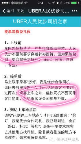 再来看第二个门槛,接单率要达到80%。 接单率是什么呢?就是平台指定了离客人位置最近的你去接单,就会在你客户端爆出来一个圆圈,你得在15秒内去接,如果十次派给你你有2次以上不接,或是由于在干其他事没接到,那不好意思,那的接单率就不到80%了,就没有奖金资格了。这个政策是用来保证什么的呢?是保证乘客用户体验的,用户总能在15秒之内就得到答复说有车来了,那是怎样的一种感觉?简直太棒了有没有?就算是出租车挂着空车灯远远的驶来你得不能确定对方是否一定停,是否一定在众多的候车者中停在你面前,是否一定载你去你的目的地,这些出租车都不能给到你的安全感,UBER在15秒内都能给到你。而随后车主司机打来的电话更是让你放下了一百个心,你唯一需要担心的就是他在过来接你的路上由于交通堵塞是否能准时到,但这有什么关系呢?明确的知道有人来接这就已经很开心拉,多等几分钟又何妨呢? 如果你知道这辈子一定会有一个人来娶你,你会在乎他是在你25岁还是30岁的时候出现吗? 再来分析第二句红色标出的规则“如果不相信我们的数据统计,可以选择不冲击奖励,但千万不要过来找我们辩论,辩论者终止合作”。这是何等霸气的条款? 但作为一个公司创始人和产品缔造者,我深深的感到这种霸气的存在是多么的重要。霸道总裁的魅力有时候就是体现在这些霸道上。 我们有时候因为各种原因,没有时间或精力或必要向我们的员工,或者合作者,甚至用户去解释更多,其实更多时候,你们照着我制定的规矩去做就去了,你只要需要相信我的智商,我的经验,制定出来的规则一定会比你能想到的更好,那就够了,这是一种对领袖,对产品,对品牌的信任。而这种信任能减少我们很多的沟通成本 。 照着去做,不需要问为什么?因为我暂时没有时间回复你!UBER作为一个全国极少人数的精英团队来管理的公司,当然没法去接待一个个琐碎的司机抱怨,所以这个时候他们选择的处理方式是:爱干干,别BB。为UBER的这种霸气喝彩。 最后一条关于推荐奖励,介绍朋友成为人民优步的司机后,不是直接奖励200元,而是被介绍的新司机在做满20单以后,你看,这个又是我刚才说的原则,司机们,给我跑起来,出去接客去……是不是像极了窑子里妈妈桑的声音?是的,只不过人家UBER用经济杠杆,而不是直接吆喝。 服务优步司机 UBER很相信经济杠杆的力量,因为优步司机只是partner不是员工,所以他们从来不要求优步司机一定如何如何,而会说建议如何如何,因为怎样怎样你就会得到好评,而好评刚才讲过了,是拿到奖励的门槛,所以实质他们还是通过经济手段来进行管理。这就是游戏规则的力量,胜过你说一万句。
