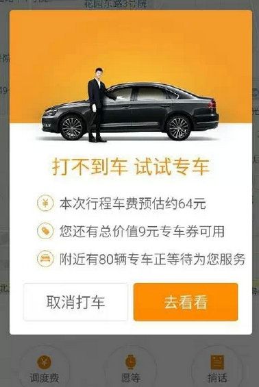 在举一组对比的例子(截图比较早,现在应该不一样了) 快的打车App 中,在叫普通出租车的等待时间中,会弹出专车的广告: 而下图是在滴滴打车 App 中,在取消叫车时,也会弹出专车的广告。 但是,对比于快的打车App的广告文案, 滴滴的文案明显给予了用户更多信息预期和操作安全感。而快的App 的广告,则应该会让用户感到困惑和不安,因为他们不知道点击之后是否就立即开始叫车,而且也不知道要花费多少钱