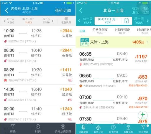 对比机票搜索界面我们可以发现: 1、 携程更侧重机票预订一站式服务,提供机票查询、航班动态、机场攻略、值机服务,从预定到登机给商旅用户提供最大的便利;去哪儿更侧重与价格查询,提供特价机票、价格趋势、低价关注服务,给价格敏感的用户提供更多比价空间。 2、 携程的7*24小时呼叫中心可以最及时地处理用户售前售后问题,给用户提供更好的用户体验。 3、 在细节上携程的日期如果是近三天会显示“今天、明天、后天”、舱位默认经济舱,减少了用户思考和选择的成本,问题是左上角返回键和右上角主页键功能重复,页面下方单手可操作区域留白太多。 4、 进入出发日期页面后,携程的日历上仅显示日期,而去哪儿显示了每日的最低票价。 搜索展示页面比较