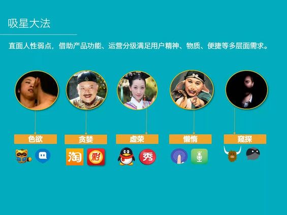 剖析人性五大弱点 人性的背后可以用一部电影,叫《七宗罪》来解释,七宗罪是指:傲慢、妒忌、暴怒、懒惰、贪婪、贪食及色欲。 在有限的时间里,我们来重点分享其中五个,希望对大家做产品运营,尤其是社交类的产品运营有所帮助。 为什么提到社交产品,yy之前在猫扑做论坛运营,建立网络电台,来到腾讯做QQ空间,企鹅FM运营,都是基于人与人的关系。社交产品是对每个个体自身人性的迎合、利诱和放大,是对整个社会中人和人关系的还原、迁移与重构。 人性五大弱点:色欲、虚荣、贪婪、懒惰、窥探 色欲: 先来看人性里最原始的一面:色欲 欲望,是人们最原始,最本能生理需求。从很早之前的拨号上网时代至今,有一类网站一直屹立不倒,大家猜是什么网站? 不是QQ,也不是游戏,一直屹立不倒的是成人网站。 现在衍变成各种打着交友、兴趣同好等各种帽子,满足着人性里最原始的需求。 从成人书籍、光盘,到手机短信盛行的年代,结合色欲的运营从未离开用户的视线,以高清美女写真图,使用户不由自主的发送短信**到**,满足心理本能的原始诉求。 逐渐,图片已经不能满足人们,随着宽带普及使得视频产品迭代衍生。2011年,快播借力将BT种子直接转换成在线观看视频迅速崛起,搜索量持续超越QQ成为百度搜索量第一的客户端软件,这种模式被百度复用,于2011年2月推出了类似产品百度影音。 还有很多视频类网站受益于色欲这个人性弱点,包括我5.1去台湾时,看到捷运地铁上有人带着耳机看youtube上的某一类有颜色的视频。 这种只能看不能互动的视频形态逐渐无法满足用户的需求,视频聊天室开始蔓延。早期比较有名的是9185视频聊天室,取而代之的是yy语音、6间房,呱呱视频、百度贴吧里也有视频直播室。 大概两三年前做市场走访调研,到一个三线城市的网吧,发现里面很多猥琐大叔,对着电脑很专注的,时而轻声细语,时而窃窃偷笑,走近一看,原来在看6间房。 当然,不管线上折腾的多热闹,约会的最终达成终究还是还回到线下来实施,于是有了各种以交友,兴趣为名的产品相应衍生。 在几年前还没有约这个词的,我们把这种行为称之为网恋。其实网恋很正常,不知道在座有没有曾经有过网恋史的,我们组有个同事叫蛋蛋,是我们做安全审核的同事,他老婆就是通过网恋认识的,据说是帮这个女生装扮QQ空间,人家没有乱来,现在娃都有了,是很好的很安静的一枚美男子。 说到约会类社交软件是什么?大家第一个想起的是什么? 有的人说陌陌,陌陌官方一直表示这只是个美丽的误会。第一次知道被用户这样理解的时候,估计陌陌也是拒绝着半推半就的,后期的陌陌一直在围绕兴趣,群组,游戏等展开布局。 或者我们说以陌陌为首的一些结合语音,地理位置的结识陌生人的社交产品是层出不穷,类似的app特别多,遇见、友加、比邻、美丽约、对面、有缘、花田,还有一个叫摩擦,不知道是不是听《我的滑板鞋》听多了,想想倒是挺形象,挺内涵的名字。 这类产品最早都是非常典型的从七宗罪中人类最原始需求色欲这个点吸引用户。好处是能够通过这种人类本能的需求触达用户痛点,也就是我们经常会说的刚需,形成病毒传播,但坏处是可持续性差,社区氛围难维持,也较难找到营收点。在这里的转型中,陌陌算是比较成功的。 来看下腾讯在2011年1月推出的微信,从一个简单的通讯应用发展为一个拥有公众平台、游戏中心,购物支付等一体化平台。在产品的发展历程中摇一摇是其中一个重要节点,很多色欲当头的人将微信作为一个重要的功能,来自草榴的统计数据也显示微信才是真正上草榴的人最爱用的App。 说到草榴,有一组数据和营收图在网上传的很火,从图片看,草榴每天都有30w左右的营收。 当然这里的数据很可能是杜撰的,我们先不管到底有多少营收,抽几分钟时间简单介绍下草榴和他的盈利模式。