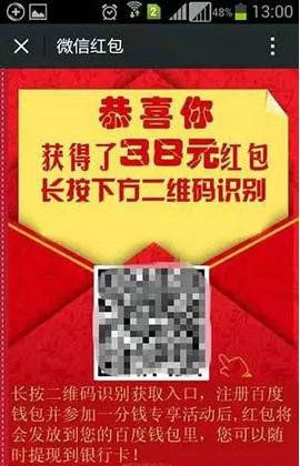 接下来到了推广者真正想大家进入操作的页面。 整个过程下来,如果你是一个新手是完全看不出破绽的。做过推广的朋友都知道,百度钱包一分钱专享推广一个朋友参加可以获得5元的收益,利用微信红包可以获得在微信群中无限的转发,而只要没操作过这个百度的钱包的朋友会极大可能完成最后一步。 当然这个微信红包你肯定是得不到的,你获得的最多的也就是一分钱专享所能获得的一点点的好处。 怎样才能让一个逼真的领取微信红包的效果,有兴趣的朋友可以自己去研究一下,这里就不再做过多的阐述。今天分享的只是一个思路,懂的人自然会去拓展,不懂的人就当看个新鲜罢了。 来源:卢松松博客 |