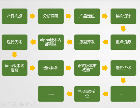 • 在研发环节,主要有这几种角色:用户、老板、开发工程师、产品经理、设计师、测试工程师。 • 虽然用户产品的每一行代码都是开发工程师所编写、设计师设计的,但是开发工程师和设计师并不直接和用户接触,而是经由产品经理这个环节。 • 虚线内的区域,就是产品研发工作。 • 产品经理要从用户处调研、修正需求,形成产品方案。 • 产品经理要和开发保持非常频繁的沟通和协调,以能让自己的方案准时实施,并和预期一致。 • 产品经理要和测试沟通测试标准和方法。开发和测试之间也会沟通测试标准和方法。 • 产品经理要和设计师沟通界面和交互设计,以设计出漂亮、好用的外观。 • 更重要的,产品经理要和老板沟通,以执行老板的想法和反馈,以及获取资源。例如需要1个设计师,几个工程师、推广资源广告位、活动预算等。绝大多数的项目还是以执行老板的战略思路有关。 哪些是产品经理该管的?(产品经理对产品质量和用户量负责任) • 功能名字的确定,例如:某功能是否叫××模式 • 向上级要设计师资源支持 • 向老板汇报并确认界面设计草稿 • 和市场确认产品广告的文字和方案 • 给用户打电话沟通反馈意见 • 和技术沟通产品方案,并催促开发上线 产品经理工作流程?