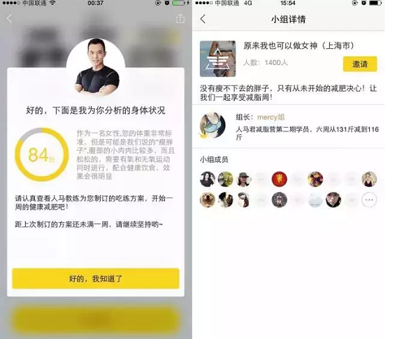 人马君app1.1版本上线一个月余,除了自家大号发发微博微信、没做什么推广的前提下,注册用户数达到18万余,图片流超过30W次,然而如果剖析他们的先前准备,大家会发现这并不是巧合,也没什么难的。甚至1.1版本次日留存46%,次周留存44%,1.2首发一周就达到了55%,也是预期中的回报。 先介绍下人马君app,它有两个特点: 1、科学的、量身订制的个人专属健身方案; 2、社群机制,解决减肥路上最大的痛点“没有伴儿坚持不下来”。 但是app做社群的很多,尤其健身又是非常细分小众的领域,如何在垂直领域做出短期爆破的社群?今天人马君和大家分享一些经验。 先说下社群、社区和社交的区别: 社交:人与人的关系。无非是熟人和熟人(联络),陌生人和陌生人(发现)、密友和密友(私密)的关系。例如微信、陌陌、微爱。 社区:人→内容→人的关系,发帖者需要有精神or物质获利所以愿意发表内容,看帖者有“某一种特定诉求的内容得到满足”因此愿意每天打开该社区获取相应内容甚至follow特定内容提供者。例如汽车之家、贴吧、bilibili、下厨房。 社群:人与人基于共同目的的聚合,内容是强心针,共同目的是关键因素,而人与人的互动,是社群活跃的一大源动力。 当我们确定要切入一个领域时,需要考虑这个领域中的关系,更适合以上哪种。在健身行业我们最终选择了社群。原因很简单,社区更强调的是内容,而健身能发布内容的人往往是晒腹肌、晒装备,晒成果。这些只是5%健身达人的行为,95%小白用户围观后无法参与进来。社交在健身中更不成立,社交的大多行为是男女之间,而我们观察健身会发现,用户健身在得到好身材前,是不具备男女社交的因素的。胖子和胖子,有什么社交点呢,尤其是一身臭汗的胖子和一身臭汗的胖子。这也是约跑软件不火的原因。 做社群的三大前提: 群主 其实微信群和QQ群是个很好的借鉴,大家会发现,活跃的微信群一定有个牛逼的群主或者核心人物;group是乌合之众的一个很好表现。社群中的用户很容易围绕一个核心人物去形成一种价值观。而如果没有核心人物,群的刷屏灌水现象会异常突出,直至消亡。 因此人马君在做app里的健身社群前,首先有数以十万计认同人马理念的粉丝基础,并培养了数以千计从人马减脂营成功毕业的学员和督教。后来大家可以看到,人马首批数百社群,每个组长均是减脂营的学员督教。重要的是,这些非常认同人马理念,积极付出的用户,我们的产品团队也一一微信沟通,每天大量的核心用户群运营维护,保证了核心用户的持续积极性、价值导向一致、社群运营技巧共享。 内容储备 人马君app做的另一核心点是官方为每个人量身订制个人健身方案。大家可以看到下图。
