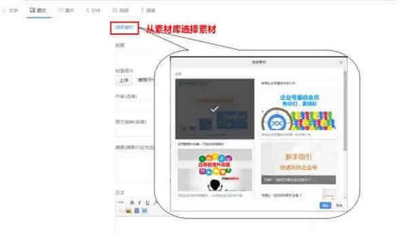 3.编内容 编辑消息内容,企业号支持文本、图片、语言、视频、图文及文件类型的消息。 这里重点向大家介绍图文消息的编辑方法。 ①选择图文类型,编辑图文 可新建图文或从素材库选择