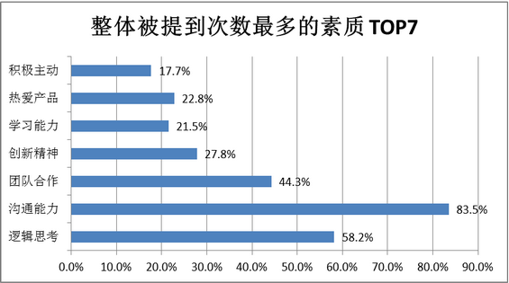 一、概述 1. 起因: 做这个分析是因为之前重读《用户体验要素》时突然想到可以用“产品设计五层面”进行产品求职分析,为此还写了篇博文《用“产品设计五层面”进行产品求职》进行梳理,把自己作为产品,那公司就是用户,我们自然要对用户需求进行一定的分析。而公司发布在招聘平台上的招聘要求是天然的数据来源,再结合以前看《人人都是产品经理》时,苏杰老师曾在其中提到过研究大量招聘广告做出漂亮的调研分析报告,对于应聘本身会是一件很靠谱的事情。所以自己就花了一天时间研究了几十家公司的招聘要求而做了这个分析,由于数据量其实还算比较少,且自己也是第一次做这种调研分析,可能做的不算特别漂亮,但应该也是一定程度可以体现公司作为用户的“用户需求”。 2. 数据收集: 本次进行数据收集时工作年限设定的0-3年,而分析数据时不再理会工作经验,因为根据有些朋友的经验,即使有些写着要求工作经验,如果你能展现出潜力,还是可以去试试。下面是我收集的数据情况介绍。 岗位数目:79。 数据分布: 二、产品经理最重要的素质与技能要求 这里对所有数据进行分析,目的是了解互联网产品经理所需要具备的素质和技能。而这些素质和技能有些是公司要求你去面试时就具备的,有些是要求你在工作中需要具备的。所以无论出现在“岗位职责”里面还是“岗位要求”中的均会被统计。 1. 企业最看重产品经理的沟通能力和逻辑思考能力 任何岗位都有其素质要求,作为产品经理,最常被提到的素质以及提到它的岗位个数占总岗位数目的比例见下图。其中沟通能力最受关注,有83.5%的岗位提到,逻辑思考能力次之,有58.2%的岗位提到。 这张图和原本个人对于产品经理这个岗位的想法也基本一致。作为产品经理,最主要的工作能够推动整个产品的进展,需要和技术、设计、运营等各岗位的人进行沟通,因此良好的沟通能力和团队合作能力必不可少。而产品经理最重要的工作是在于能够把握用户需求,指导产品的走向,做出能吸引更多用户的产品,因此逻辑思考能力和创新精神至关重要。此外,产品经理是一项对综合能力要求很高的岗位,所以要想做的好,首先要对产品有热爱,然后才能够积极主动的不断学习提高自己。 个人觉得图中各项能力占比的原因是,作为企业,首先最看重的是员工做事的能力,所以招聘中对沟通能力和团队合作精神的关注比较高。而逻辑思考和创新精神则是产品经理区别于其它岗位的较大特点,所以关注度也较高。而其它的更重要的是在于个人的自我管理,其实应当是任何岗位都应该有的。 2. 企业最需要产品经理具备需求分析和撰写产品需求文档的能力 产品经理需要掌握的技能有很多,最常被提到的有产品运营、数据分析、交互设计(包括了解Android和iOS设计规范)、office等软件的使用、需求分析和文档撰写、原型制作,提到它们的岗位个数占总岗位数目的比例见下图。另外还有一些像技术、测试等有少量岗位有提到。 可以看到技能中需求分析和文档撰写能力被提到的次数最多,79个职位中有71个都提到了。可见这的确是产品经理安身立命的必备技能,只有能够把握住用户的需求,并且清晰的写成文档供设计师以及研发人员进行设计、开发,才能够体验出产品经理最核心的价值。同时像能够原型原型、了解交互设计规范、懂得数据分析和有一定产品运营能力都有超过一半的岗位有提到,可见产品经理的确是一项对各方面要求都比较高的岗位。而其中软件使用提到的公司较少,个人觉得并非是因为它不重要,而应该是这个技能一来太基础,二来完全可以在工作中很快的学会,毕竟工具只是工具,主要目的还是用来完成目的。 三、初创型、成长型和成熟型公司对素质和技能要求的异同 本人做这个分析的目的其实更多的是为了求职,所以我更关注的是招聘广告中的“岗位要求”,毕竟企业既然写在职位需求中,很大程度还是希望员工在入职之前就能够掌握这些技能,也就是说我有意识的加强这方面的技能将有利于我面试成功,以便真正进入这个行业。而对于“岗位职责”里面提及而要求中没提及的,应该还是可以通过入职后再行学习加强。所以在这小节中的数据都是以“岗位要求”为分析对象。 对于三种类型的公司划分,是按照拉勾网的标准。大体上初创型指的是未融资或者是天使轮的,成长型则是处于A轮或者B轮融资,成熟型则是C轮以及以上或者已上市的公司。 1. 三种类型公司岗位要求中明确提到的素质占比 整体来说和第二节中包含“岗位职责”基本一致,无论哪种类型的公司最看重的三项均是沟通能力、团队合作精神和逻辑思考能力。稍稍区别的是热爱产品相对得到了更多的关注。原因应是如果应聘者对产品有极大的兴趣,将大大增加他学习的主动性等。继而可以在以后的工作中,完成“岗位职责”中的职责。 另外可以看到很明显的是,成熟型公司比初创型和成长型公司都更看重团队合作能力,应是成熟型公司团队规模会更大,员工相对于其它两个一来分工更明细,二来需要打交道的人也更多了,所以团队合作精神就显得更加重要。同时也可以看到沟通能力的要求也是比初创型公司要高出不少。 而初创型公司较其它两个占比要高的是学习能力,这应该也是和初创公司刚起步,人手方面不会很充足,员工需要很