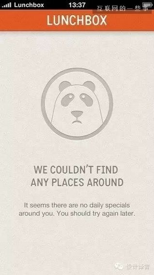 空白的内容页面 译注:一个略显苦逼的熊猫脸,说道,『我们在周围啥也没找到看起来你周围没有什么特别的事情发生。你可以过一阵子再试试这个功能。』通过空白页面取悦用户,可以做这些: 品牌(On brand):介绍并强化你的品牌元素 亮点(Different):有创意或者展示你的幽默感 共鸣(Relatable):展示你的产品温暖人性的一面