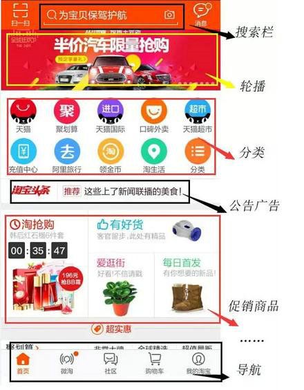 3、吸粉加购物双导向的店铺导航 2.7 页面设计 手机端商城搭建和PC端逻辑总体一致,但是由于客户下单会更简单粗暴,因此页面呈现风格需要更清爽简洁:文字不多在精(手机上密密麻麻的文字估计吓跑一堆人);更偏向以大图的形式吸引眼球;分类精准模块较少等。 梳理之前,先简单粗暴地偷图,以最有参考价值的某猫(手机端app)和某狗(微信购物)手机端商城为例,下图是大致的页面构建模型。 淘宝手机APP 京东微信购物 对比上两图,基本上可以确定出微信商城构建的大致框架:导航栏、轮播、分类、粉丝互动(移动小广告)、促销优惠、各种分类商品……最后是固定的导航栏(不是全部都要有,只是包括但并不局限于这些内容)。下图是微信商城构建设计稿(忽略文案)。