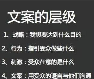 其中战略(最终目的)在整体结构的最顶层,战略的下一层是受众产生行为,受众产生行为再下一层是影响受众,最底层才是文案的表现。