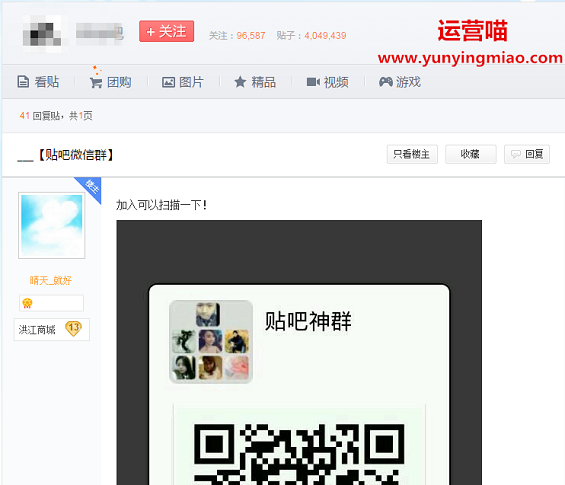 这和微博是一样的,只是内容的方向和渠道的做法在微信上有些差异,如果能够将这两件事情做好,阅读量和粉丝数是水到渠成的事情。 微信公众号中的渠道 2015年8月27日,微信曾在青岛举报线下公开课,当时微信讲师团队曾透露,目前微信公众号的数量已经超过1000万。而通过平时的观察你会发现,这1000万+的公众号之中,真正可以创作出优质内容或者提供有价值服务的少之又少。大量的订阅号只是转载文章,内容同质化严重。 在这种环境下,最先注册的一批微信公众号由于积累粉丝的时间较久,靠转载也能取得不错的阅读量。而后注册的公众号往往很难生存,尤其是没有原创能力的公众号。 这个时候你需要想尽一切办法,从其他渠道往微信上导用户,你的种子用户就是你的渠道,你今后的内容能否扩散出去,就全看他们了。 当然,你也可以加入或者建立一些微信群,这也可以成为你的渠道,还有你身边的人,他们也是你的渠道。 当内容质量和发布时间差不多的时候,渠道就成了决定成败的因素。 如果你做了几个月原创内容,粉丝还不见涨,只有寥寥几百人,可能不是你的内容没做好,而是你忽略了渠道的作用,没能将好的内容传播出去。 微信公众号中的内容 如果想让自己的微信公众号快速成长,你必须要自己做内容。 无论你是做什么主题的公众号,无论你是否对这个领域有深入的了解,做订阅号就必须要做好内容。 现在微信这个平台早已经过了红利期了,做订阅号的机会还有但真的不多,如果你自己不能做内容,很难在转载大军之中脱颖而出。 如果你真的没有能力创作内容,那整理内容的能力总是有吧?可以整理一些《2015年十大XX排行榜》、《盘点这些年XXX》等,这些文章一般阅读量都不错,比如某娱乐八卦的微信大号,就长期推送这种文章。 其次,在社交媒体之中,追逐热点是一定要做,这些热门事件传播的很快,基本上没有强大的粉丝数时,想要高阅读量就只有追热点和做活动,而做活动需要一定的经济投入,而追热点完全免费。 这里给大家举个例子,运营喵的微信公众号粉丝不多,一般原创内容的阅读量在1500左右。有一次突发奇想去追麦当劳《如果我三十岁没有结婚你就娶我》这个广告的热点,最终收获了第一个10万+阅读量。 前两天微信公开课的H5刷爆朋友圈,这个热点我也追了,效果还不错,当天推送的文章《微信公开课H5刷爆朋友圈,看微信、支付宝、网易是怎样玩大数据营销的》的阅读量是45171: 追热点属于不花钱,不需要太多资源,人人都可以做到的一种引爆方式,非常适合自媒体,改天我们将单独推送一篇文章谈谈如何追热点。 二.如何查找微信群 在微信群发广告比较适用于积累种子用户、追热点、推广活动等。 日常内容我建议还是少在微信群之中发,除非你有非常优质的内容,否则效果真的非常有限。 在微信群发广告, 第一个问题就是去哪里找微信群? 目前有以下几个渠道可以使用: 1.专业的微信群网站 在搜索引擎之中搜下“微信群”,即可找到N个相关网站,都有二维码,直接扫即可。 2.百度贴吧 百度贴吧上也有大量的微信群信息,如果是做大众类公众号就使用搜索引擎的site搜索功能,可查找到大量的微信群。 如果做垂直类的公众号,可以固定关注一些贴吧。 3.淘宝购买 淘宝上有大量的商家出售微信群,一般500人的群几毛钱一个,花几十块钱可以加很多很多。