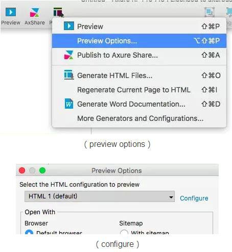 Axure不仅能制作静态的视觉稿、页面,还能添加交互动作,是进行原型设计的最佳软件之一,更是产品经理和交互设计师必备的软件之一。对于产品经理来说,画完线框图,再加上交互就成了更加形象的原型图。一份生动形象且充满逻辑性的原型图,交到设计师或者程序员手中能令后续的工作进展的更加顺畅。 Axure不但支持在PC端生成html网页形式的预览,同样也支持在移动端的预览(包括交互!)相比于PC端网页形式的预览,移动端的展示效果更加逼真,能近乎真实的模拟一个APP。 那么如何把加了动效的原型图在手机上展示出来呢?这里介绍两个方法 方法一 1.按照将要展示的手机分辨率尺寸制作原型图,比如我想要在iphnoe5s上看那就是640* 1096 (除去state bar的40 所以注意并不是喔640*1136) 2.注册一个axure share账号,用来在服务器上发布自己的作品 3. 发布设置:publish>previews options>点击configure