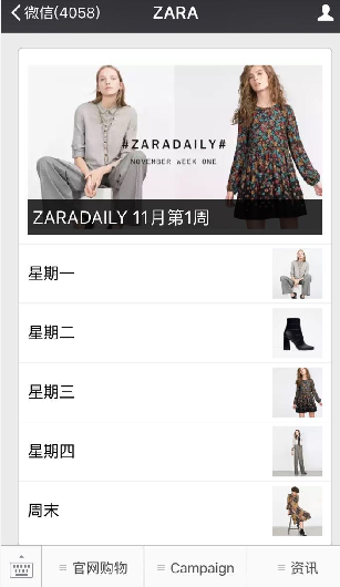 写在前面 虽然微信公众号注册数超过1000万,但经常被拿出来做案例的多是些自媒体(媒体属性)账号,从企业营销角度来看,他们没多大参考价值。只有像真正的营销账号才能学习营销,但好的企业微信号少之又少。哪些才是好学习榜样,像优衣库,ZARA,速写,联想等品牌企业必然有他们成功之处。这些都是聪明的企业,每一分钱都会花的有价值,不能说他们的做法完全适合你,但必然是最好的借鉴和向导。 从它们账号提供的功能服务,粉丝数量,图文内容,阅读量基本就可以判断。试想下:如果一个企业微信能真正持续产生价值,毫无疑问企业就会不断的投入人力和财力,这时整个账号的运营表现会很有规律有规划。 “微信,不要试图让所有人关注,但要让愿意关注的人持续获得价值,不要害怕谈产品,那是企业最擅长的东西” ——题记 企业微信到底该怎么做才对,我觉得过去大家都走了弯路,更多企业是在迎合粉丝,而不是在做营销。所以最后是有粉丝数,有阅读数却没有价值,无关痛痒的鸡汤文章,吸引一大批活动控,这些工作并没有实质性的用处,没有帮企业卖出一件产品,也没有让粉丝对企业有更深了解。微信运营成为很多企业里最鸡肋的工作,运营人员也没有地位。 直到最近看完一本书,我猛然发现,两点之间直线最短,营销也如此。企业只要能够给用户(粉丝)提供价值,用户就愿意跟随,比如我关注招行微信还款,关注一号店获得订单状态,关注海底捞微信排队,我不需要鸡汤文章,花里胡哨的活动,我需要简单直接高效。 前一篇文章我分析了优衣库的微信,优衣库启示录:微信6亿用户跟你没关系?不要紧!看不懂这点你真该淘汰了 今天我们再看看@ZARA和@速写CROQUIS 两个企业微信,很有意思,也值得学习。 一、“广告”才是对粉丝真正有用的信息 我一直强调微信运营,“最好的营销就是企业做自己”做擅长的事,提供擅长的服务。ZARA的微信就是这样,它的微信很“功利”,只讲产品,优惠,服务,其它的一概不谈。但是粉丝似乎很喜欢很受用。 先看【微信自定义菜单】简单明了,官网购物,Campaign和资讯,全是关于产品,购买和店铺的信息。 ▶ZARA微信自定义菜单