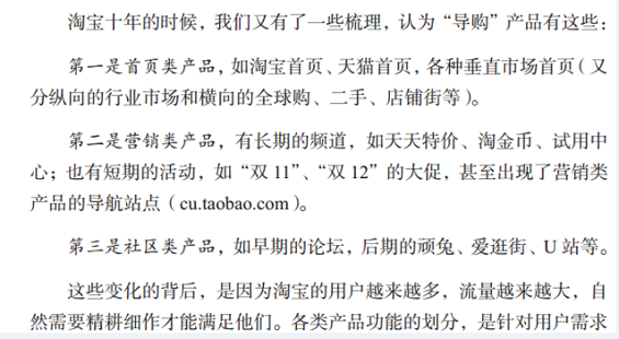 麻豆说:淘宝作为产品,也是从小到大,不断完善发展的一个过程… 最近拜读了苏杰产品大神的佳作《淘宝十年产品事》,让我收益良多,产品视野得以拓宽,也初步了解到电商产品的一些特性,同时在搜索产品和反作弊系统上有了进一步的认识,非常感谢。有一点遗憾的是,书籍更在于广度,比较适合刚入门的初级产品经理;深度上稍有不足,亦或者是淘宝官方在信息纰漏上做了要求。 此为读书笔记,没有特意整合,看到哪想到哪,故此内容上没有逻辑关系。 书籍内容范围:针对淘宝电商,讲述C2C、B2C、C2B等电商模式、商品分类、搜索、导航、订单、评价、天猫、聚划算等相关产品事,以及淘宝产品的发展历程; 一、做产品讲究经验,前人的经验可以借鉴与学习,自身可养成不断记录总结的习惯。据调查显示,互联网企业是最不愿意为员工投入培养成本的,大多都是来了就立马干活,因此当有前辈分享经验时显得尤为珍贵;现阶段在产品行业没有规范学习体系时,培训机构也随着兴起。 二、关于群体写作:定流程、分角色、树标杆。思考问题:网络小说如此发达,一个人写几百万字是不是太累?而且作者思路、题材有限,如何让追书粉丝参与进来协作,也就是群体写作,完成一本由几百人或千万人共同奉献出来的佳作。 三、关于产品经理的成长,知识和技能到了一定阶段时,学习案例更容易进步;同时,一个产品经理对所在行业趋势发展必须有一定了解,例如电商、互联网金融等,不懂相关的业务知识,很难进行下去。 四、产品经理从根本上说是来解决问题(满足需求)的,而不是直接做产品,当问题被解决后再考虑产品化; 五、一个买家的淘宝(电商)之旅;购物过程归纳:入口→导购→决策→交易; 六、导购定义:一群买家,从某个购物需求出发,通过某个产品功能,到达一个商品详情页的过程;准备进行交易阶段。按照有无明确购物需求类颗粒度细分: