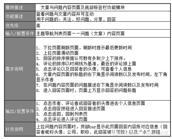 一、 简介本文档主要定义PMCAFF APP的功能详细描述和前端页面的各个模块的内容和逻 1. 目的 此文档的目的主要是清晰、有层次的定义页面原型中各个模块的内容来源和相关逻辑。 2. 范围 此文档主要描述PMCFF APP中前端页面涉及到的功能点、相对应的后台管理功能支持、以及部分交互细节。本文档主要读者为技术部的前端工程师,以及视觉部的视觉设计师。 二、 用户角色描述 三、 产品概述 最大化满足市场和产品以及运营工作者对于产品学习、交流、讨论、社交、求职,以及开展与产品相关的组织和活动所产生的需求,为用户带来一个全面的服务、组织与对接平台和优秀的用户体验,为公司带来固定的高粘度的用户,带给用户有价值的社区,构建帮助用户提升技能,拓展交际,快速学习与思考工具与平台。 1.目标 构建全国最大的产品类社交、学习交流与求职线上平台。 2.总体流程 3.产品结构图 4.产品信息结构图 5.功能摘要 四、 产品特性 1.登陆注册 1.1需求说明 1.2用户界面 1.3用例流程 2.提问与搜索 2.1需求说说明 2.2用户界面 2.3用例流程图 3.主题导航列表页 3.1需求说明 3.2用户界面 3.3用例流程图 4、问题(文章)内容页面及互动 (此模块可以再细分进行用例说明) 4.1需求说明 4.2用户界面 4.3用例流程图 5.个人资料 5.1需求说明 5.2 用户界面 5.3 用例流程图 6.消息中心 6.1需求说明 6.2用户界面 6.3用例流程图 7.个人中心(我的互动) 7.1需求说明 7.2用户界面 7.3 用例流程图 8. 设置