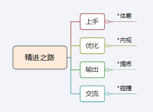 重心转移,跟进活动/路演推广。参加企业咨询。 [XJ工作笔记] 二、精进之路 如果要说我自认为比同龄朋友优秀一点点的地方,我认为是“勤思”。有些事情(第四部分细说),越早明白并付诸行动,越能让你快人一步。精进,绝不嫌早。我依照自己的经历总结的精进之路,大致可分为这四个步骤:“上手→优化→输出→交流”。 [精进之路] 1、路径 知乎@王哲曾说:“能很早找到人生的目标与方向,并坚定不移地为之奋斗的人,是真正的天才,这种天才,要比高考考700分,还要稀缺10000倍。”我对此深以为然。 我当初因为没方向,投递了三份简历,一份是CAD绘图员、一份是机器人测试员、一份是网络推广专员。三个方向我都有兴趣,但最终被网络推广选择,才开始在职业道路上慢慢寻找目标和方向。 我能给所有同学分享的亲身经验是: