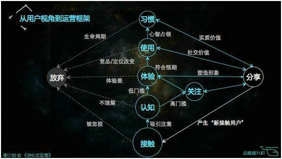我们前面提的整个用户养成运营框架其实都融合在里面了。我们已经简单介绍完了运营框架的核心内容。 运营框架它诞生于用户视角这个坚固的基础之上。因此也不会因时间、外界变迁而改变,拥有旺盛的生命。 在这个框架中,我们得以洞穿运营工作的表象进而悟出运营工作的实质: