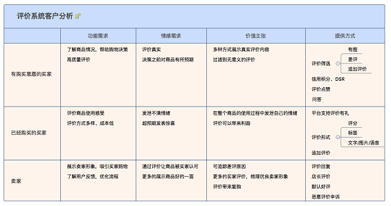 在我们还不用淘宝之前,口碑是通过人和人之间口耳相传的,消费者得到的评价更多来自于周围的人的介绍,XX家的羊毛衫质量特别好;XX家的运动鞋特别舒服,你要买的话可以再讨一下价格;XX家新来个导购,长得特别漂亮…… 我们在购买决策之前会参考许多外界因素,这些外界因素来自于购买后的体验、使用后的体验,来自于亲戚朋友或者旁边买衣服的陌生人,每一个场景在电商的用户评价中都可以复现。 1 目的 1.1 对用户 将用户在购买后对商品、服务、物流等相关信息的真实感官表现出来,为其他用户提供购买决策,减少购物成本。 1.2 对平台 提高复购率;构建商家信用评价体系,帮助商家分层,合理分配平台资源。 2 评价系统用户分析 2.1 有购买意愿的买家 有购买意愿的买家需要了解商品的真是情况,获得高质量的评价帮助自己购物决策,是评价产品的高频使用者,此类买家由于厌倦海量的评价、对真实评价有迫切的需求,往往会更加注重评价的筛选,有图评价和追加评价更容易被关注。 2.2 已经购买的买家 已经购买的买家可以分为两类,一类是对商品、服务、物流有超预期的体验或者发表不满的情绪,这类买家的评价重要性权值要高很多,要让这类买家在产品使用过程中尽可能多的机会来发表建议(包括评价问答);另一类就是商品和预期差不多的买家,这部分买家占据大多数,通常不会将自己的感受表现出来,这时需要平台介入提高评价率,简化评价流程,降低成本。 2.3 卖家 评价对卖家来说一种特别好的收集用户反馈流程,通过评价可以帮助优化购物体验、商品品质。但卖家反而是评价系统的风险用户,由于评价会直接影响客流转化,所以卖家会更有意愿去破坏评价初衷和规则。 3 评价的种类 3.1 信用积分:好中差评