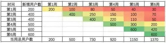 上面的表格,就是投资用户分组表格。 横向看,是某组用户的投资用户数,随时间变化的留存情况。 比如第一行,第一周共新增200名投资用户,到第二周留存100名,到第三周留存80名…… 纵向看,是某一周投资用户的构成情况。比如第三列,显示第三周的730个投资用户,是由第一周进入的80个+第二周进入的150个+第三周进入的220个构成的。 通过投资用户分组表格,我们还能计算出留存率分组表格,只需将每一行,每周的留存用户除以对应的新增用户数,即可获得下表: