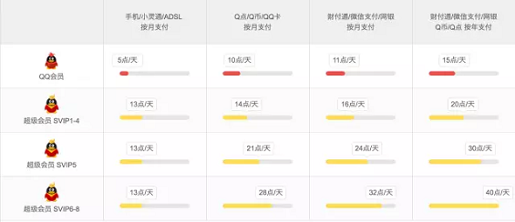 4、计算方式 依据用户历史数据,加权平均得到用户每天可以得到的经验上限 A,设定的等级数量 B,该体系可持续时长 C。按照指数函数或者幂函数(自定义系数项)计算每个等级的比例,将可持续时长C 按比例分配到每个等级,算出来看看数值会不会太离谱,比如升级需要10000天。腾讯发展到现在也才差不多19年,你一个等级需要花费用户27年谁玩…… 确定每个等级所需要的天数 Dn 大概合理之后,用 A * Dn 得到第 n 个等级所需要的升级经验,如果希望得到每个等级需要的总经验,可以将前 n-1 个等级的经验求和。 以 QQ 会员为例,由于不知道 QQ 不同付费方式的用户比例,这里举例就暂且用最高和最低取平均值计算: