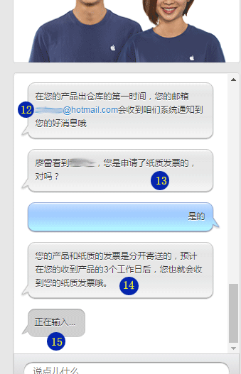 12、就我所关心的发货问题,再一次补充他们本身的解决方案。且具体到提醒细节,同时通过顺带明确用户邮箱是否有误,及让用户明确查收邮件的邮箱。实际场景中很多用户就会同时拥有多个邮箱,而且容易混淆。这里就很巧妙的要解决这个问题。 13、主动跟用户提及发票的事宜。发票问题一定是很多用户来特意专项咨询他们客服的。 14、主动提及发票问题可以在问题发生前就让用户了解相关问题。避免让用户后期产生不必要的疑惑,比如收到快递时没有看到发票。 15、“正在输入”的交互形式很舒服;国内很多客服软件也有响应提示,不过多数比较生硬和不够明显。