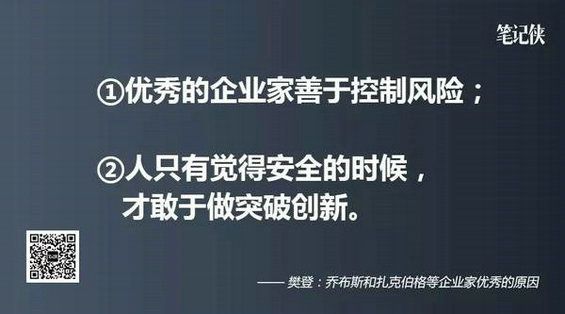 好多人找我推荐书,并且都会来记书名;这能看出来很多人都是喜欢记书名的。但其实大多数的情况下都没有读,有些人还买了这本推荐的书,就是不读。种种理由,比如没时间,读不懂,甚至还有说买了送人了。 后来我发现这是一个社会问题,中国人使劲地推阅读,推来推去都是推销量;销量再高,不真正去读还是没有用的。这个社会问题,如果能够得到解决,就厉害了。 知道了要解决什么问题,就可以上路了;当然,我要为目标而努力,还要拉人进来一起解决问题。就像唐僧取经,不能等到孙悟空来了再去,一定是不管怎样也要先上路,这就是圣人的做法:我必须做到,所以我能够。 四、创业——“脚踏两只船” 有人创业时会感到疑惑:到底是应该孤注一掷义无反顾,还是应该脚踩两只船,前后犹豫? 有一本书叫做《离经叛道》做出了深入的研究,研究为什么很多人创业会成功,后来发现比尔·盖茨、乔布斯、扎克伯格等他们有一个非常重要的特点就是脚踏两只船。差不多就是:能拿得下这个订单,我就做;拿不下订单我就继续读哈佛。如果要分析原因,大概就是: 第一,优秀的企业家,不是善于冒风险的人。善于冒风险的人是赌博者,优秀的企业家是善于控制风险的人; 第二,人只有在觉得安全的时候,才敢于做突破性的创新。