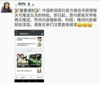 不过,目前并没有公开的申请入口开放给公众号,只有后台的微信官方通知。 当然,也有非媒体资质的个人公众账号有2次推送权限,比如冯大辉的『小道消息』。 如何安排推送 那么,上述这些可以一天多次推送的公众号都是怎么在安排自己的推送呢? 据二师兄观察下来,它们都有自己固定的推送时间和内容安排,也就是栏目化运营。比如『中国新闻周刊』就公布过自己的栏目规划: