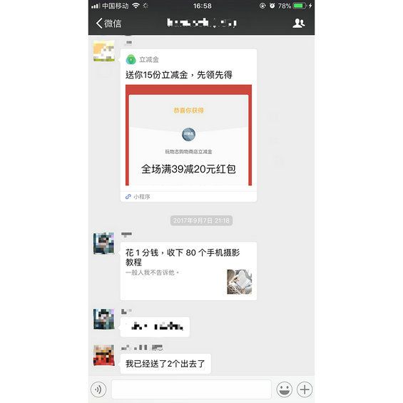 立减金其实在一定程度上类似美团和饿了么的分享红包,可以通过分享给多位微信好友,或分享到微信群来促成裂变式增长,而立减金的卡片式展示更具有吸引力。