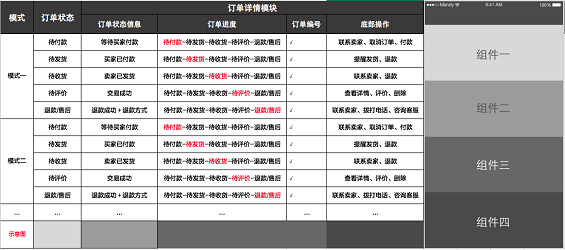 根据固定的状态设置,可以把界面的组合分为几种组件模块,然后映射到Excel表,加以说明和标注,如图表所示,右侧Excel表的底部一栏色块对应右侧原型图的不同模块,二者对应可解释说明不同模式下订单详情页面的组件元素有哪些?不同之处是什么?