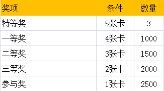 (右击在新标签页中打开,即可查看大图) 概率算法 因为本次活动总共五个奖项,分别对应集齐1-5张卡,而根据财务预算,每个奖项的数量又分别不同。卡片本身就是有概率得到,即要求活动的可玩儿性,又需要保证每个奖品发放出去的数量不能超过预算。于是基于此,做了一个保守的算法,在此分享给大家,如果大家有更好的方式,可以一起进行下探讨。 奖品分布情况如下: