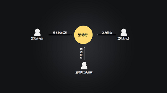 通过观察产品可以知道,活动主办方通过活动行发布活动,活动参与者通过活动行报名活动,同时,还有活动周边服务供应商提供支持,如活动布置、视频直播支持等,如下图。