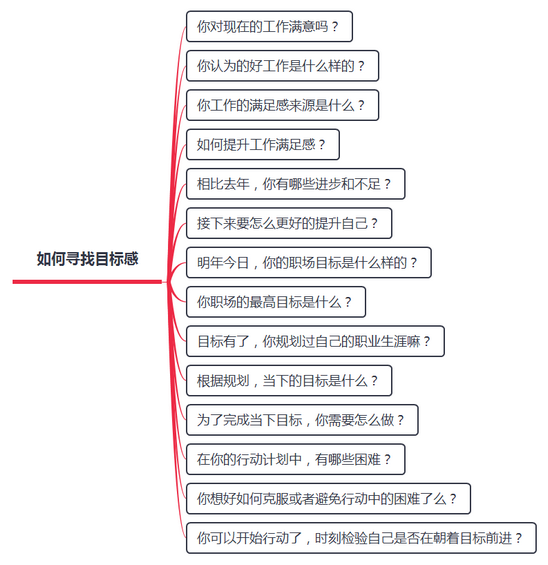 当你对自己工作岗位不满的时候,有没有尝试着去跟领导问一问,了解他对你接下来的安排,确定你的想法他能不能满足。即使不能直接去聊,也能玩笑式的问一下,领导懂的话会单独找你的。 2、保持你的目标感 年龄增长的同时,能力和见识一定要跟上。所以,忙忙碌碌也不一定好,清闲一些未必是坏事,重要的是你在做与目标方向一致的事情。 一说到目标,很多人上来就是年薪10万、20万、50万,没有对目标进行具体化,更没有拆分目标。职场中的目标感激发成就感,目标达成的时候是工作中最开心的时候。所以寻找目标感要从工作本身入手。 你工作的满足感来源于什么?你对现有的工作满意吗?不满意的话,怎样才能满意?满意的话,请找出满足感的来源。工作的满足感无外乎是这样的:认为自己的工作是一份好工作,给足了薪水,福利氛围都很赞,工作充满了成就感。 你未来想成为什么样的人?你工作的最高目标什么?最终你想要成为怎样的职场人?假如你想要成为领域专家,你打算花几年时间达成,把时间拆分以后,你现在处在什么阶段?为了完成现阶段的目标,你该做哪些计划?行动计划中会遇到哪些困难? 这些困难有什么方法解决?你需不需要帮助,能够求助于哪些人?怎么去让对方肯帮你?你在行动的过程中,有没有按预期完成小目标,完成后可以奖励自己,没完成的时候要反思,更要想办法去追上进度。 当然,目标也是要调整的,遵循现实情况,积极应对,但从不丧失目标感。