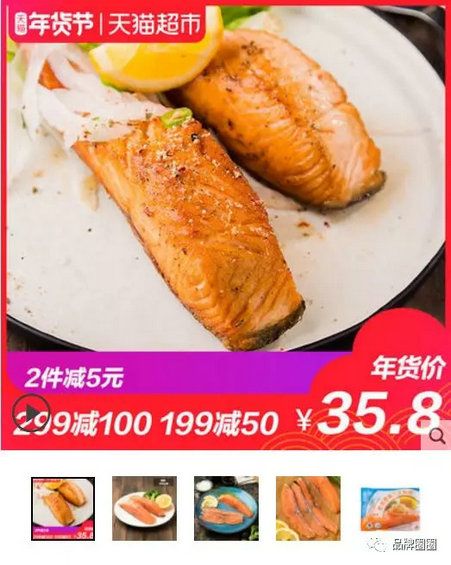 另外,虽然你没办法直接向消费者出售一盘烤鱼,但你可以通过宣传素材(比如包装和详情页)向人们展示出来。 比如卖三文鱼的——天猫上排在最前的那一家,它的详情页封面,肯定不是只有一条鱼,而是一盘用鱼肉做好的菜。