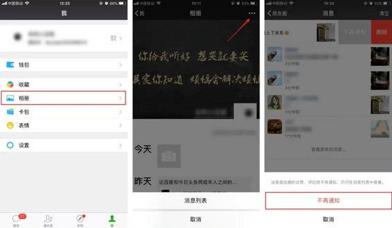 很多情况下我们点完赞并不想收到其他人的点赞评论提醒,这时候,点击「我」-「相册」-「…」选项 -「消息列表」,在某一条评论或者点赞通知上左滑(安卓用户则是长按这个消息),就会出现「不再通知」和「删除」选项。