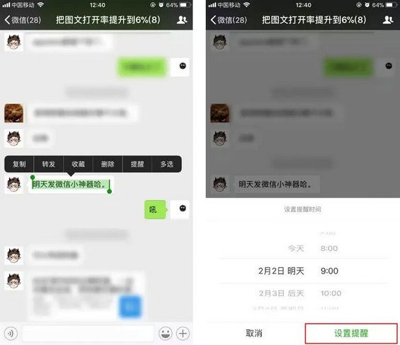 07、微信文章置顶 想必大家都遭遇过正在看微信文章时有人发微信找你的情况。如果要退出再重新进去的话,还得重新从订阅号或者朋友圈中找出原本要看的文章。 现在微信文章置顶到聊天页面的功能。就能够解决文章中途退出又进的尴尬情况。 在微信文章阅读界面,点击右上角「…」-「在聊天中置顶」,就能置顶你正在阅读的文章。文章看完后,点击右上角「…」-「取消置顶」即可。 微信聊天和好友约好明天一起吃饭或者看电影,怕忘记时间怎么办?微信可以直接设置消息提醒功能: 长按需要设置提醒的消息,点击「提醒」,选择提醒时间后,点击「设置提醒」,到时微信会在“服务通知”发条消息,点击消息后即可定位到当时的对话。