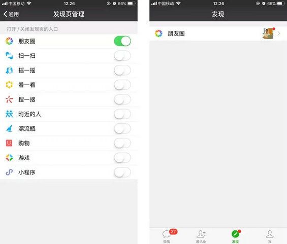 当我把所有功能都关闭只保留朋友圈后,是不是看「发现」页面瞬间清爽许多呢?