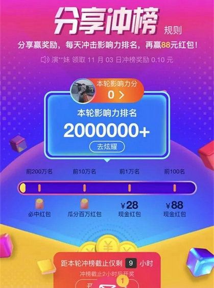 分享冲榜——分享商品赢取奖励,每天冲击影响力排名,赢取现金红包,这也是一个新玩法。有必中红包,瓜分百万红包,现金红包各类,主要还是刺激用户分享商品,进而拉新。
