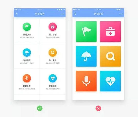 随着移动优先的趋势,APP的设计也越来越受到公司重视,不断地提高APP的设计质量是每个设计师的追求,有哪些设计中的细节被你忽略了呢?让我们一起来看看这些细节你都把握住了吗。 视觉表现型问题 01、统一的图标设计风格 图标设计在整个APP设计中是比重较大的板块之一,图标设计风格有:线性图标、填充图标、面型图标、扁平图标、手绘风格图标和拟物图标等。无论我们选择何种表现形式的图标都请保持统一性,相同的模块采用一种风格的表现形式,如果是线性图标就保持一致的描边数值。 图标在配色上面也要保持有规律的统一,采用相同颜色是比较常用的配色方式。如果你采用不同色相的配色方式,要保持整体的配色协调,不要出现饱和度、明度反差过大的配色而影响整体的视觉协调。