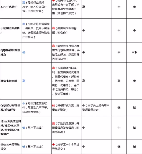 这些推广方法绝大多数基本都是我操作过或接触过的各种微信推广方法。所以对其成本,流量效果,品牌效果,用户转化率效果都有个大概的预估。
