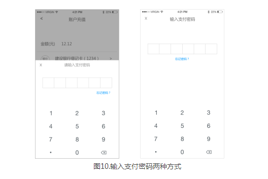 图10.输入支付密码两种方式 跟产品经理争论了很久输入支付密码时应该用整屏的页面还是半透明弹层。 产品经理的理由有两个,一是使用整屏的页面无需考虑数字安全键盘在不同屏幕的适配问题(数字安全键盘由外部提供,我们公司内部可控性较低),二是微信在支付过程也出现整屏输入支付密码的页面。 我一开始也纳闷,为什么微信会在收银台使用两种输入支付密码方式(微信截图如下)?